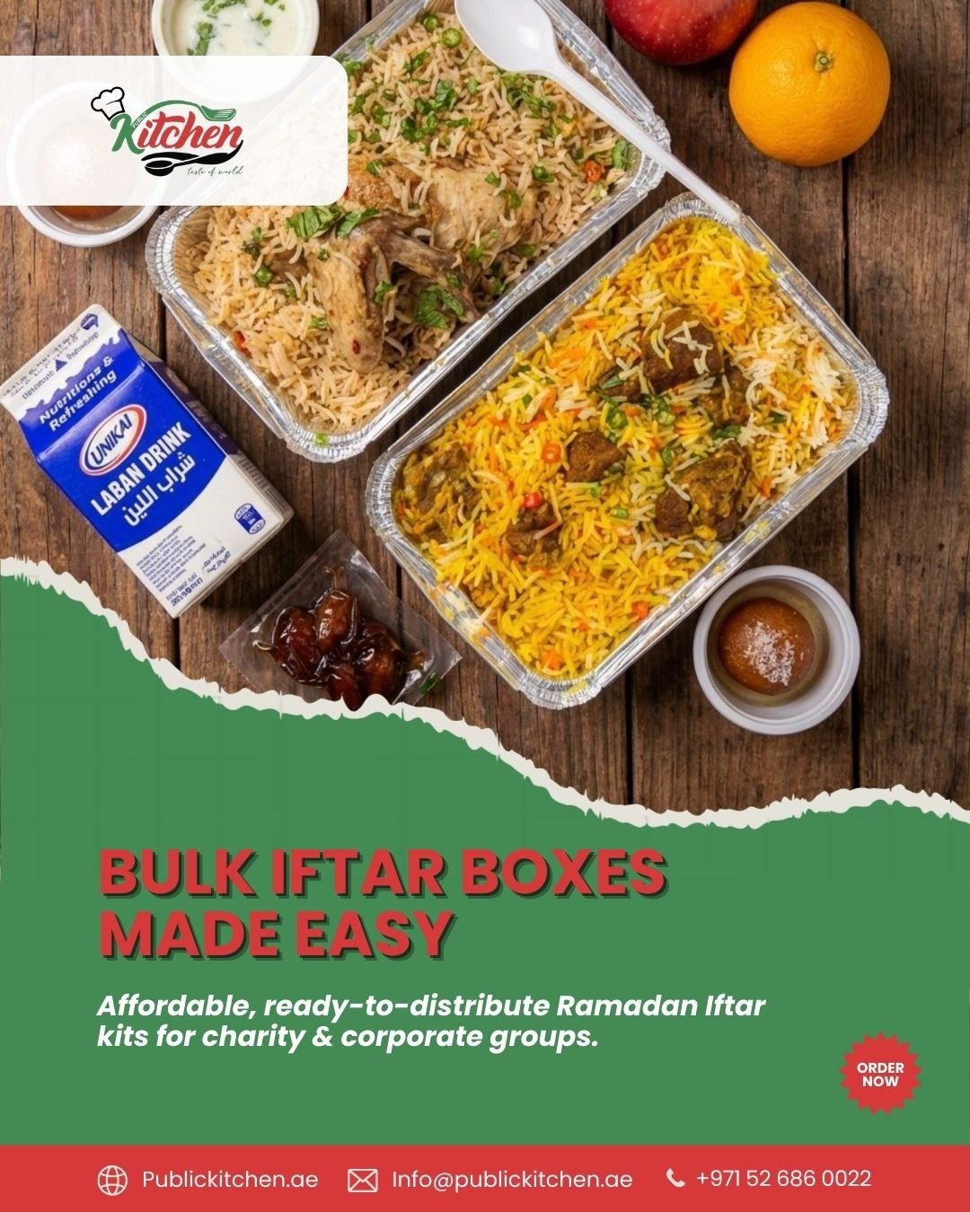 8. Public Kitchen combines affordability, quality, and reliability. We use fresh ingredients, maintain strict hygiene, offer flexible menu options, and specialize in charitable distributions (like mosque iftar and labor camp meals). Plus, we have years of experience in large-scale food logistics